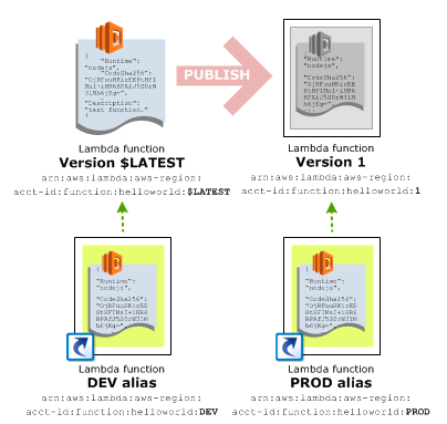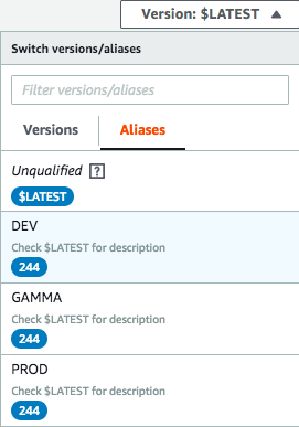 No caso o ":1" acima indica qual version queremos que seja executada. Novas versions podem (e devem) ser criadas quando existe alguma mudança no código (sempre na versão de base chamada de $LATEST. No caso acima, uma nova version seria numerada como ":2". Isto permite que tenhamos diferentes versions disponíveis para execução, mas cria a questão: Como lidar com estas mudanças num ambiente de produção? Preciso modificar o código de quem chama para indicar qual versão deve ser executada?