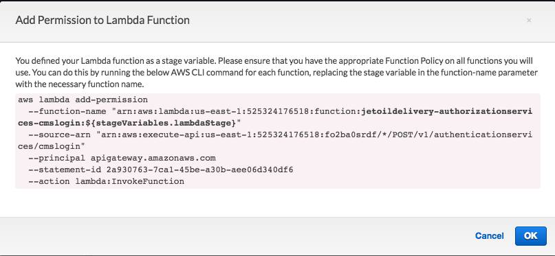 aws lambda add-permission --function-name "arn:aws:lambda:us-east-1:525324176518:function:jetoildelivery-authorizationservices-cmslogin:DEV" --source-arn "arn:aws:execute-api:us-east-1:123456789012:fo2ba0srdf/*/POST/v1/authenticationservices/cmslogin" --principal apigateway.amazonaws.com --statement-id 2a930763-7ca1-45be-a30b-aee06d340df6-DEV --action lambda:InvokeFunction